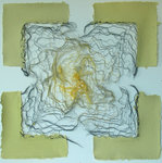 In deze werken combineer ik handgeschept papier met verschillende materialen en technieken. Het resultaat is steeds anders, hoewel mijn thematiek steeds te herkennen is.