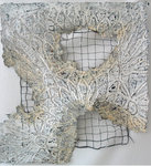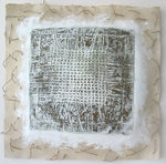 2006Handgeschept bewerkt papier gecombineerd met een textielnetwerk. Ingelijst achter plexiglas.