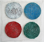 2005Tableau van 4 handgeschepte papieren tegels die samen één vorm maken.