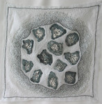 2005Combinatie van borduurtechniek en handgeschept papier. Het werk is achter plexiglas ingelijst.